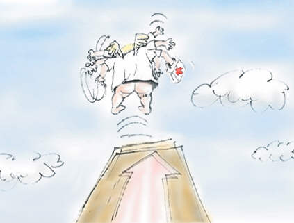 Woher weiß ein Schutzengel eigentlich, daß sein Schützling in Gefahr ist? Natürlich von der Vorhersagemaschine. Auch im Himmel hat Hightech den Einzug gehalten. Freilich: sie wirkt mit ihren alten Lochstreifen und alten Datenbändern schon ein bißchen antiquiert, was aber nicht heißt, daß sie nicht den entferntesten Stern im Universum noch orten kann. Bei Gefahr ertönt eine Alarmsirene. Bolzen und Bänder setzen sich in Bewegung und ein blinkender Code "Moki" blinkt auf einem veralteten Monitor. Otmiel rast dann an ein astronomisches Fernrohr, checkt die Position seines Schutzbefohlenen, durchblättert hastig das riesige Schutzengel - Anleitungsbuch für das Verhalten im Notfall und springt von einem langen Sprungbrett vom Himmel herab und läßt sich wie ein Stein herunter plumpsen. Dann kurz vor der Landung geht sein Hemd wie ein qualliger Fallschirm auf, und Otmiel knallt auf den Boden. Das Abenteuer kann losgehen ! |